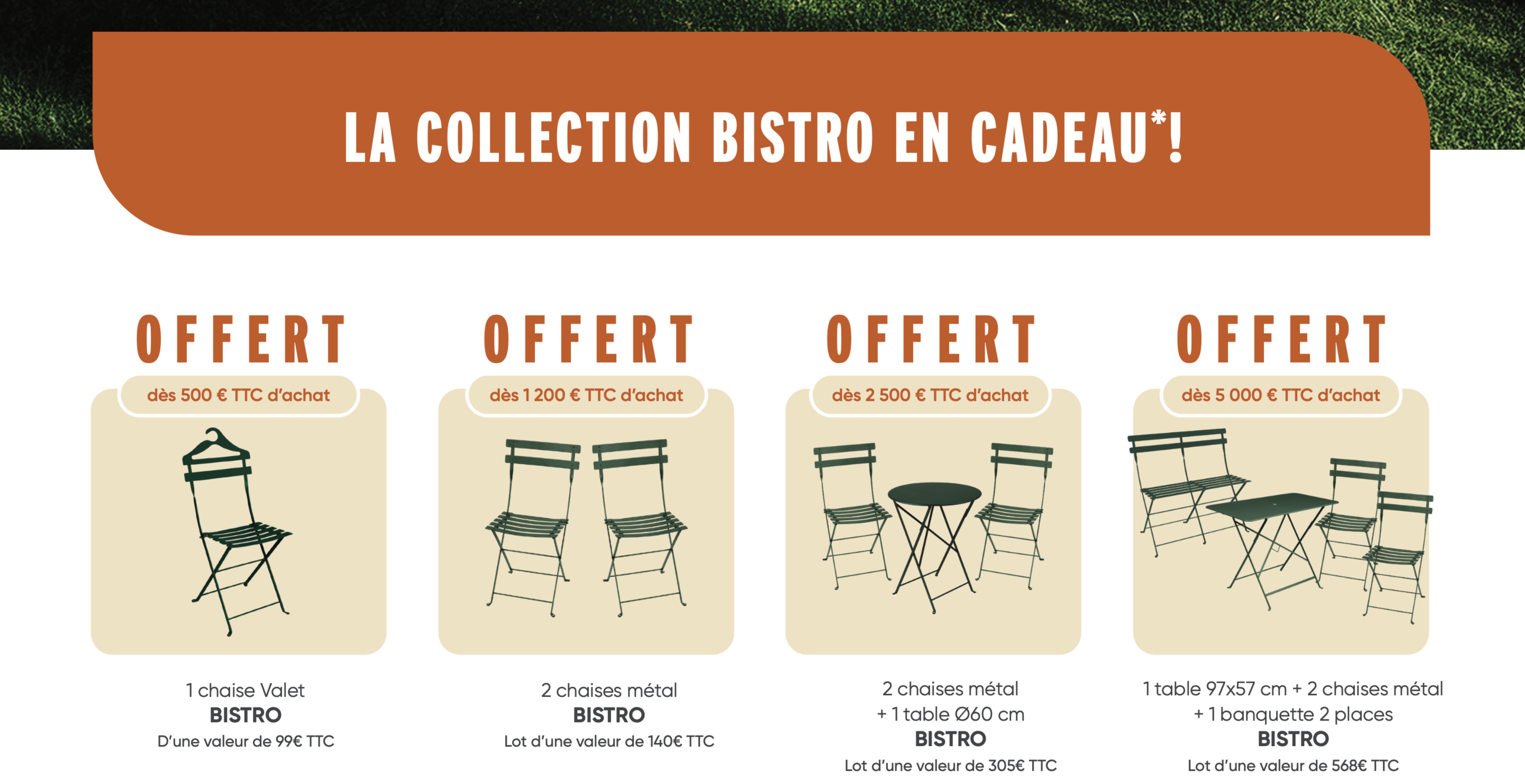 - Recevez gratuitement deux chaises métal et une table de la collection Bistro pour créer un coin repas convivial et plein de charme.